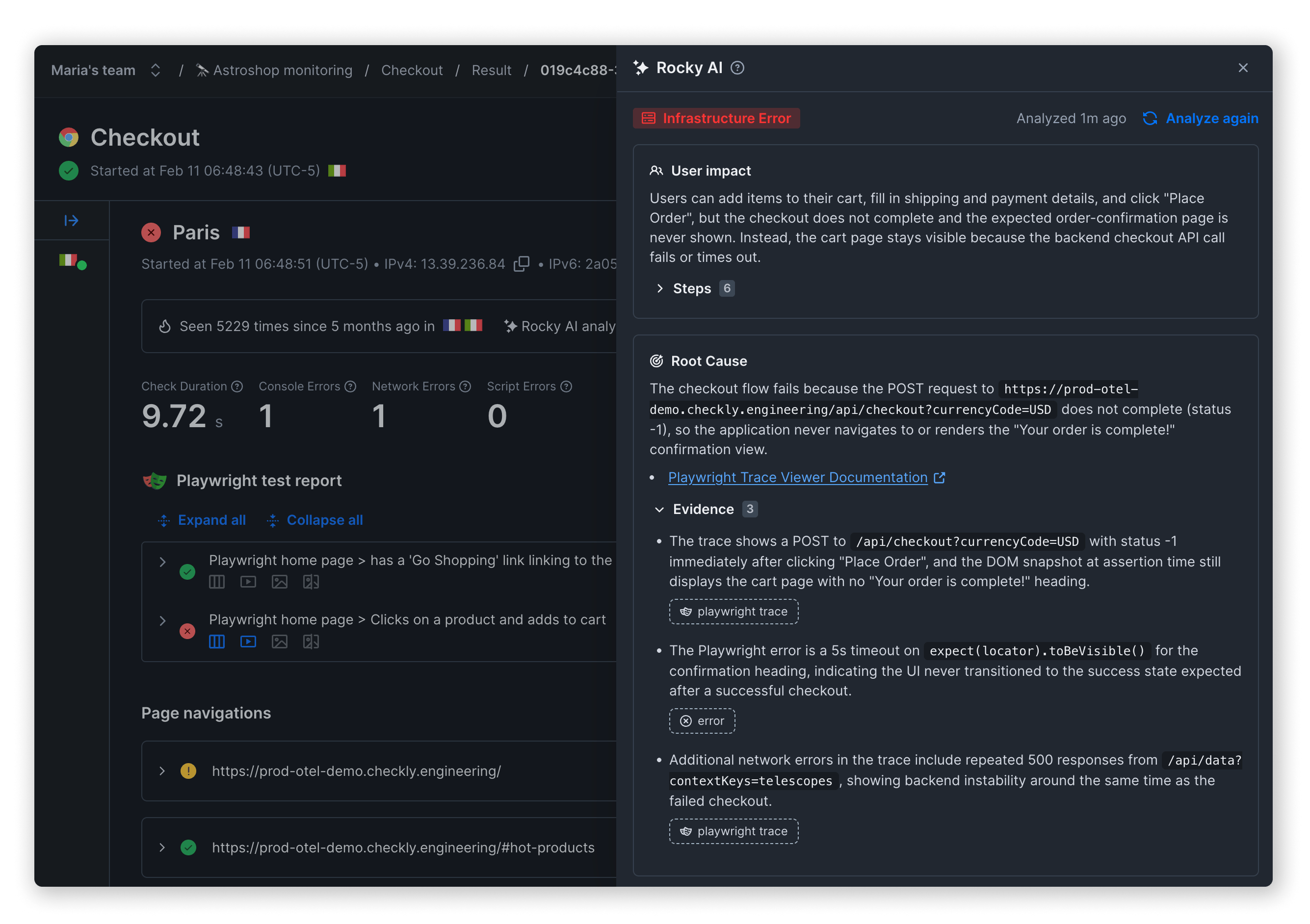 Know exactly what went wrong across distributed systems using Checkly Traces and Rocky AI to bubble up key information required for engineering to diagnose the problem and make a fix.