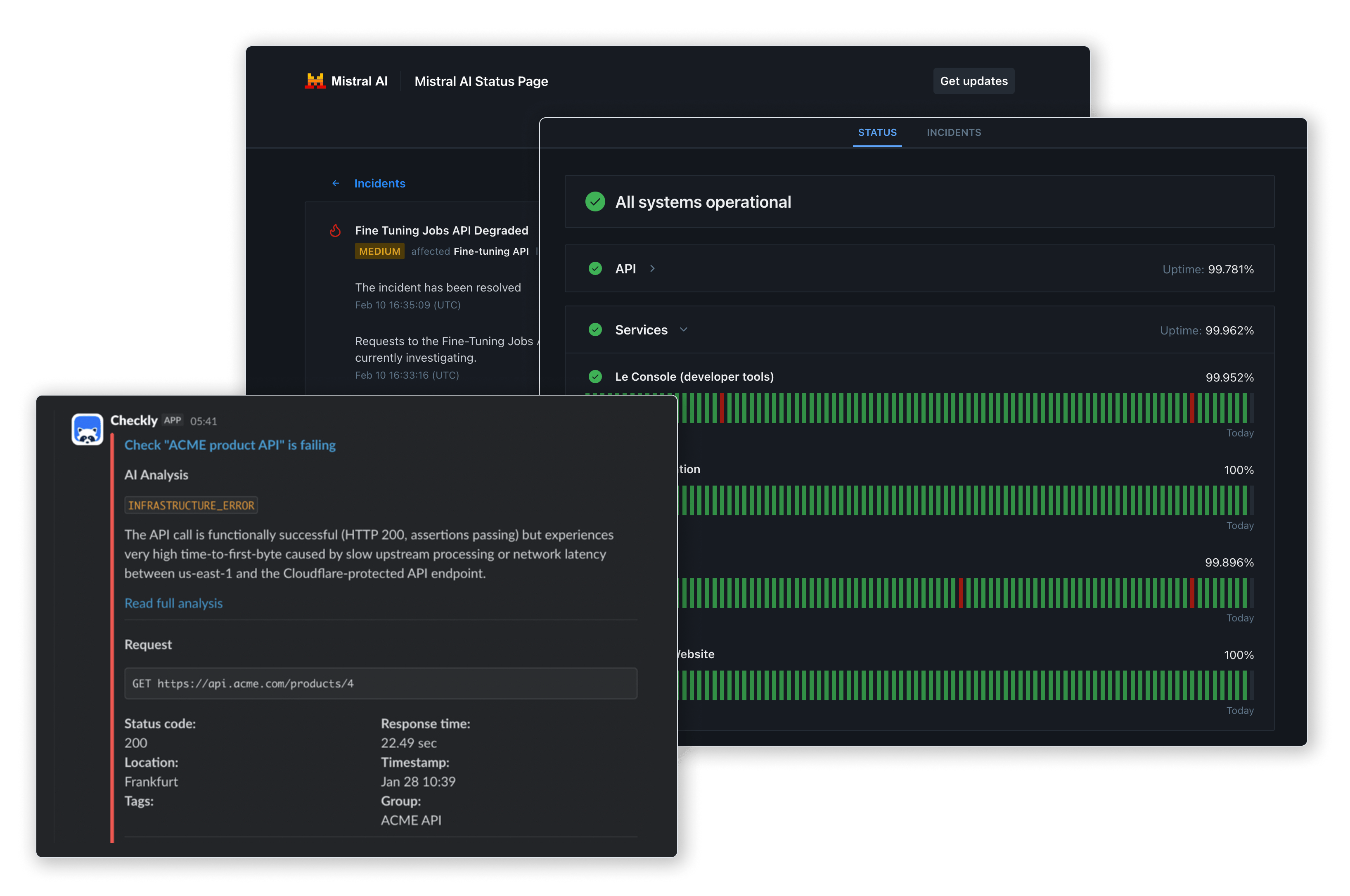 Get detailed alerts and logs in Slack when a check fails, degrades or recovers.