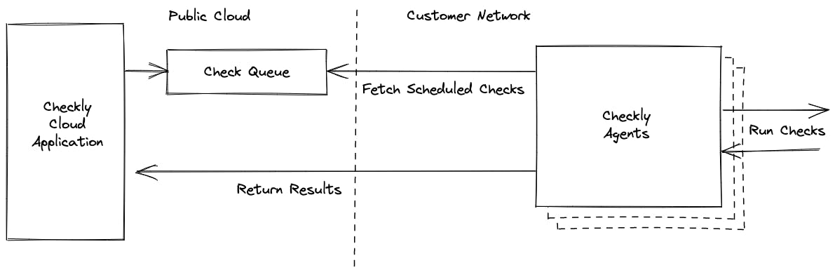 With Checkly, users interact with the public Checkly application which is hosted in the public cloud. All scheduling and management of checks, as well as check result details are stored in our systems. Checkly agents in private locations fetch scheduled checks, run them along with their associated setup and teardown scripts, and return the results to the Checkly application.