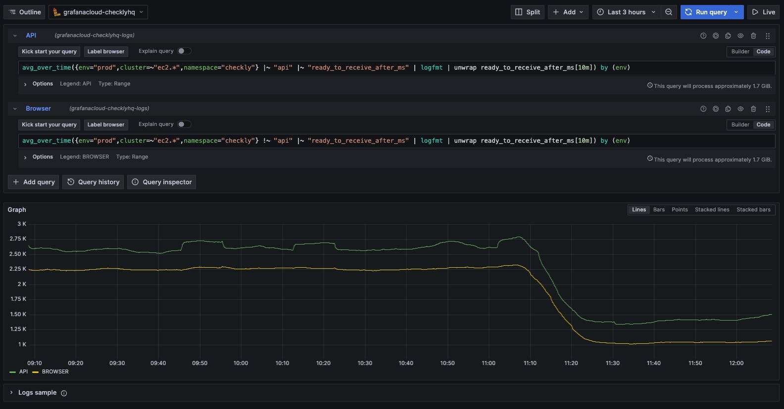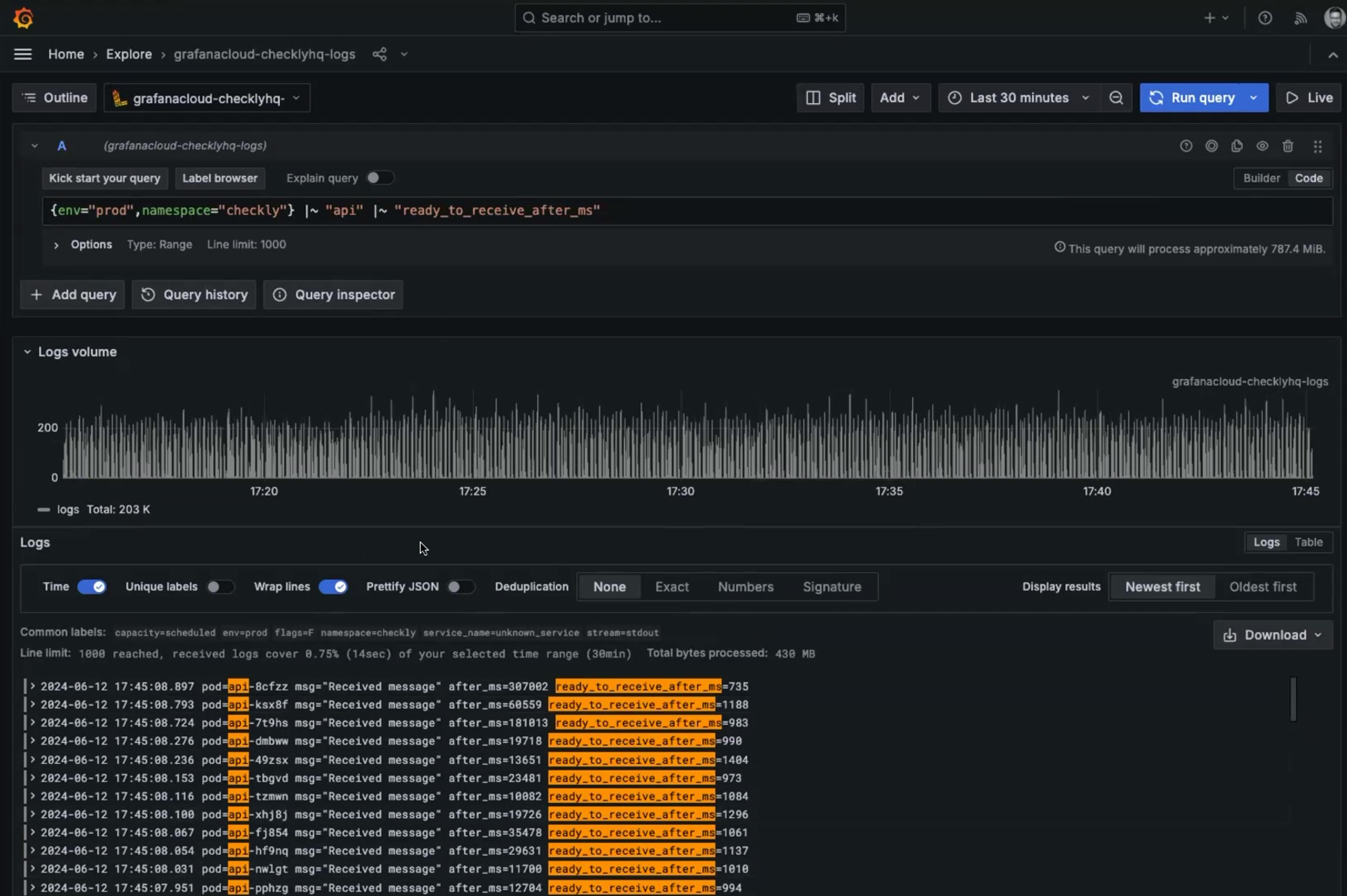 Now every production check run was logging its time to receive, but of course a single measurement, or even dozens, wouldn’t give a clear pattern. Despite my simple, unstructured log message I wanted to be able to treat the reported data as a metric. That’s where Grafana Loki came in.