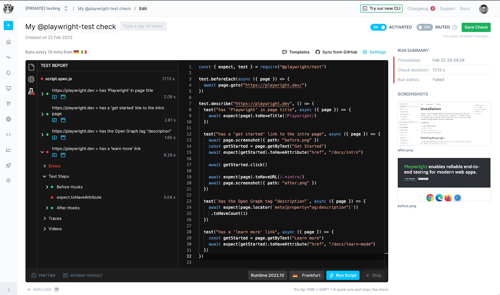 In this release we’ve also added a new UI that accurately reflects the structure of PWT test cases in your checks, and makes it easier to view and sort through assets related to those checks. With the new UI, assets like screenshots, videos, traces, error logs, and test and monitoring assets are organized into test cases. Users can also take advantage of the new UI to create and edit checks (via the Browser Check Editor Page) and sort through scheduled check results (via the Check Result Page).