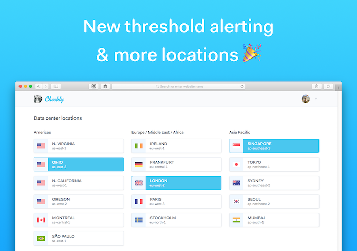 As of today you can select up to eight data center locations for API checks and four for Browser checks from the total of sixteen locations. Moreover, we commit to adding new regions as AWS makes them available like Milan (Italy), Cape Town (South Africa) and Bahrain.