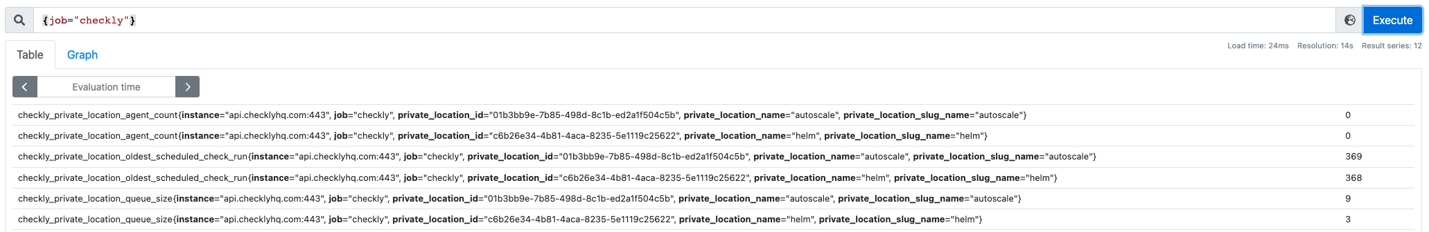 checkly_private_location_oldest_scheduled_check_runwe recommend a threshold of 60. This means that if there are any checks queued for more than 60 seconds, new replicas will be added to process the checks. A similar result would come from acheckly_private_location_queue_sizethreshold of 2. - query: This is the exact Prometheus query that is used to get the metric for the threshold comparison. You need to add a label query to ensure you are getting the metric for the correct private location. We recommend using the Private Location ID as the
