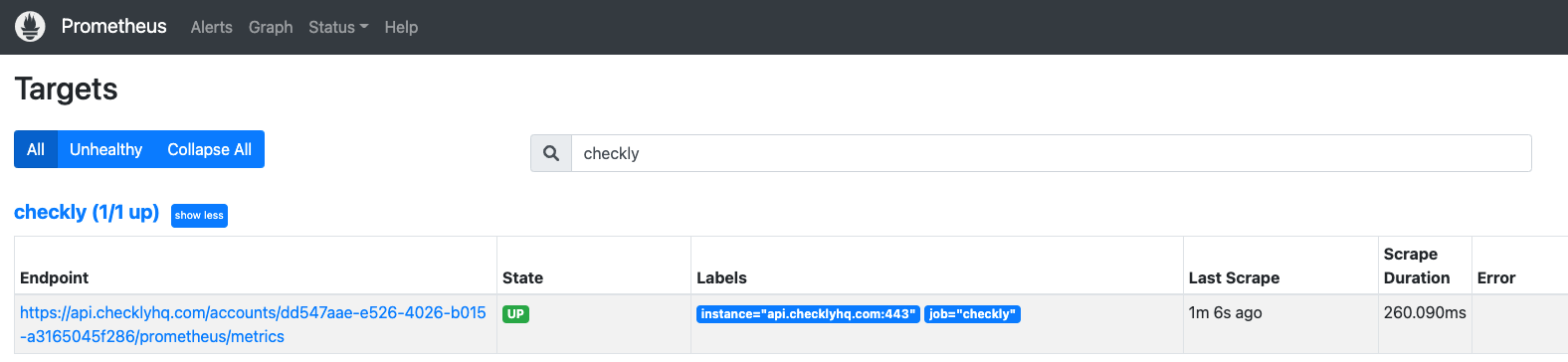 Once you save and close the Prometheus configuration, the changes will load automatically. If you navigate to Status -> Targets in your Prometheus UI you will now see the Checkly endpoint being scraped successfully.