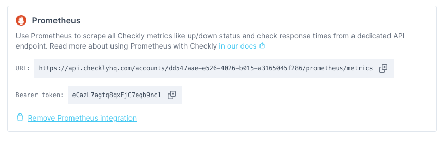 - You need the Checkly Prometheus integration enabled and have the URL and token handy