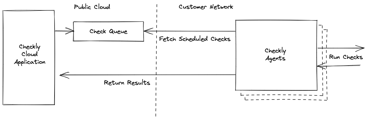 With Checkly, users interact with the public Checkly application which is hosted in the public cloud. All scheduling and management of checks, as well as check result details are stored in our systems. Checkly agents in private locations fetch scheduled checks, run them along with their associated setup and teardown scripts, and return the results to the Checkly application.