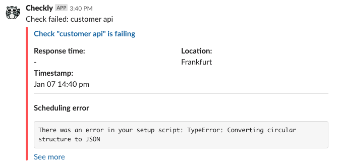 With this update, any check that fails to schedule will trigger an alert on all configured alerting channels with an explicit scheduling error. Here as an example from Slack.