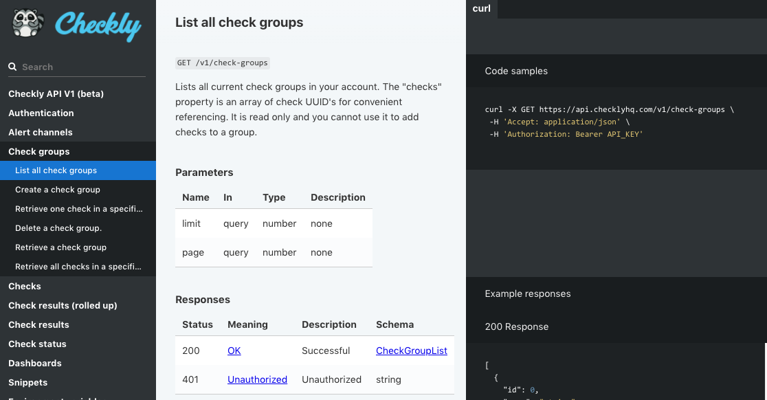 You can now create, update and delete check groups via our public API. This is useful if you want to create checks in bulk that share defaults and common settings like run locations and alerting channel.