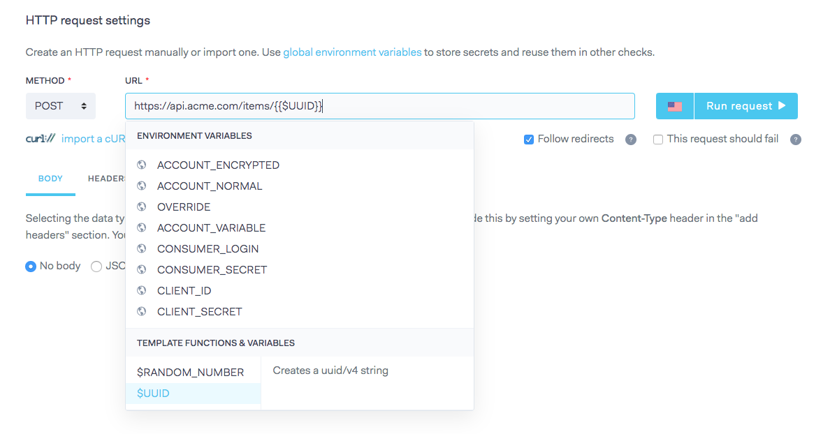 In some scenario's, using a setup script just to generate some data on each check run is a bit overkill. You can now use the tags {{$UUID}} and {{$RANDOM_NUMBER}} throughout your API checks and templates. You will see them pop up in the drop down when you add variables.