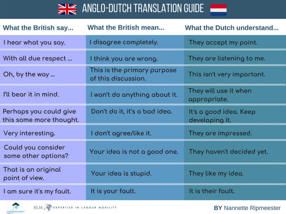 Communication and collaboration across cultures can become frustrating quickly. A typical example is when the British manager says “I hear what you say” when they mean “I disagree completely” and the Dutch team member would understand this as “They accept my point”. Typically Germans love their meeting hygiene: the meeting is set up with a clear agenda, starts on time and ends on time. When they have a meeting with for example someone from Egypt, who arrives 45 minutes late, the Germans will feel like the Egyptian does not respect their time. All the while, the Egyptian has no idea why the Germans are acting so grumpy.