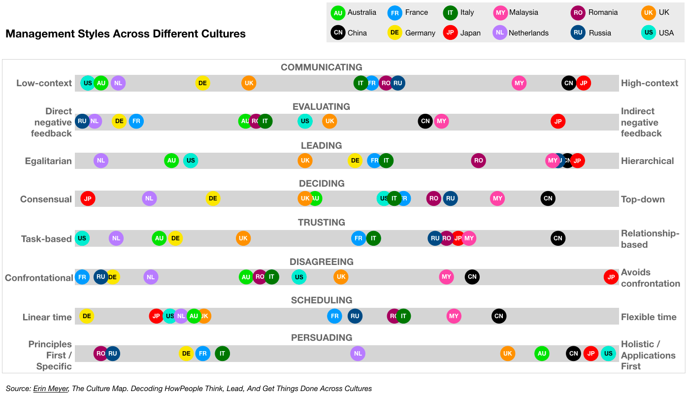 In her book “The Culture Map”, Erin Meyer provides a framework for handling intercultural differences in business. The framework covers 8 dimensions, such as communicating, evaluating and deciding, and maps different countries along each dimension’s scale. The Culture Map helps increase awareness within international and intercultural teams and clarify expectations.