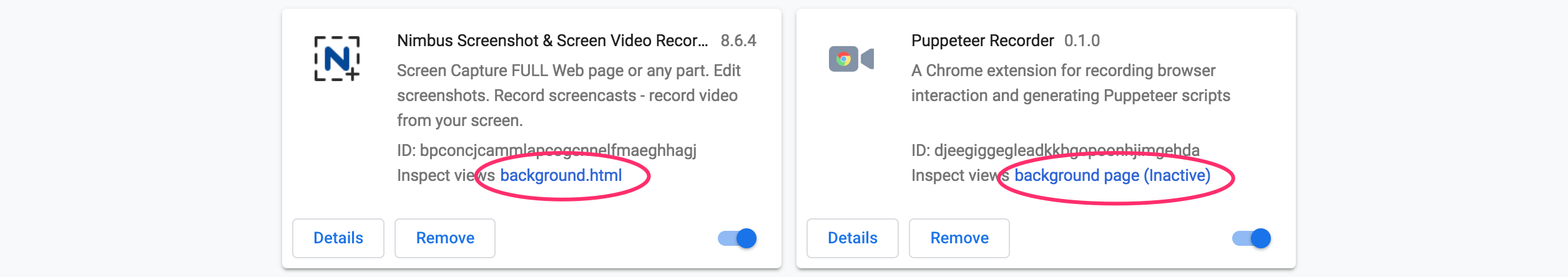 The content script depends completely on page reloads and how/if/when it is injected. In the specific case of Puppeteer Recorder, the content script attaches message handlers to elements in the current page. These handlers send messages of the events we want to record to the background worker.