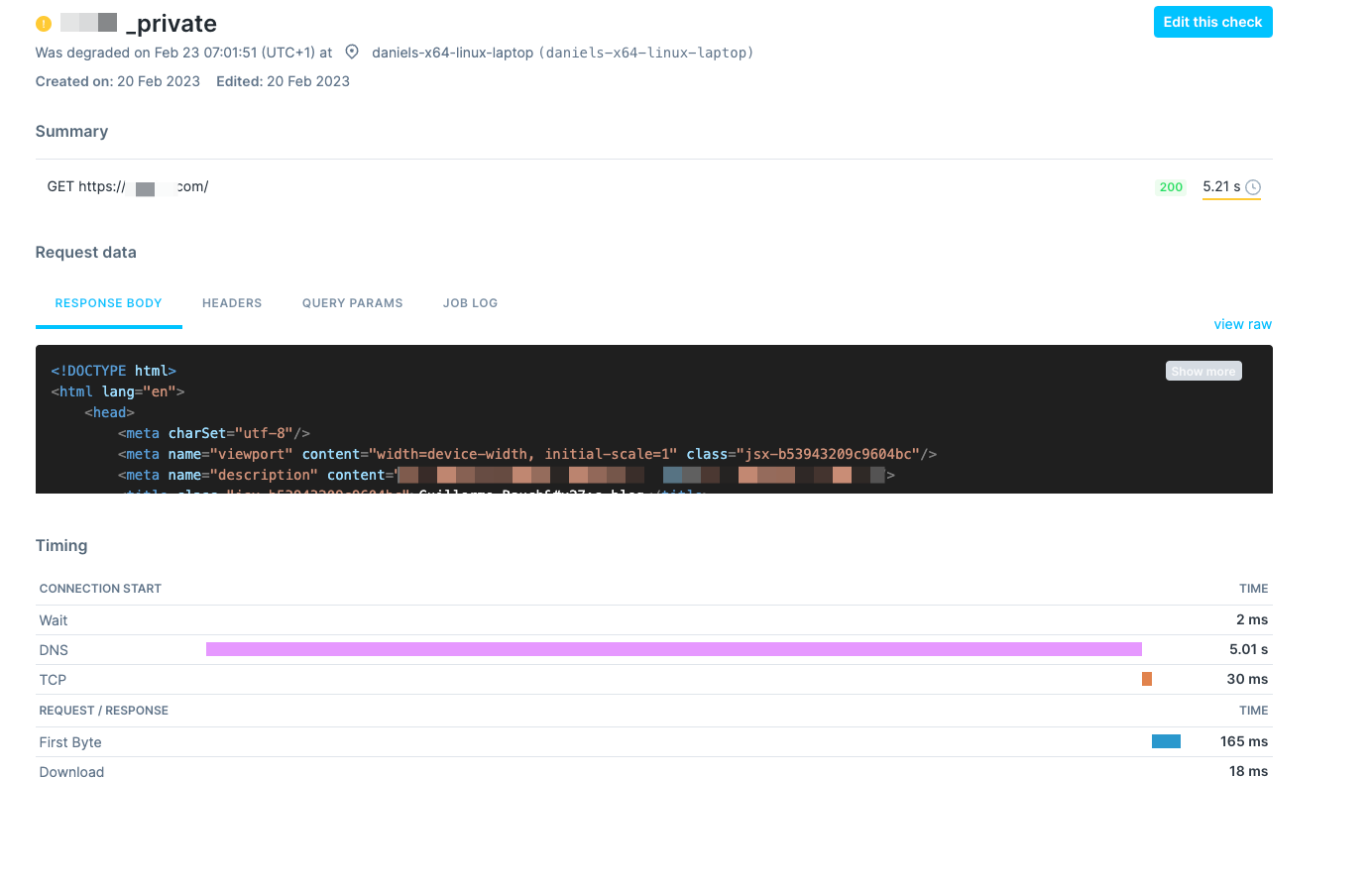 By now I already had a suspicion what could be the cause of this issue, but I wanted to be sure. I still had to reproduce it. Checkly makes analyzing occasional problems like this really easy because you can go as high as running checks every 10s. Additionally, Checkly supports sending email alerts when an API check degrades (is slower than 5s). I created a check and an alert on my private location and then waited.