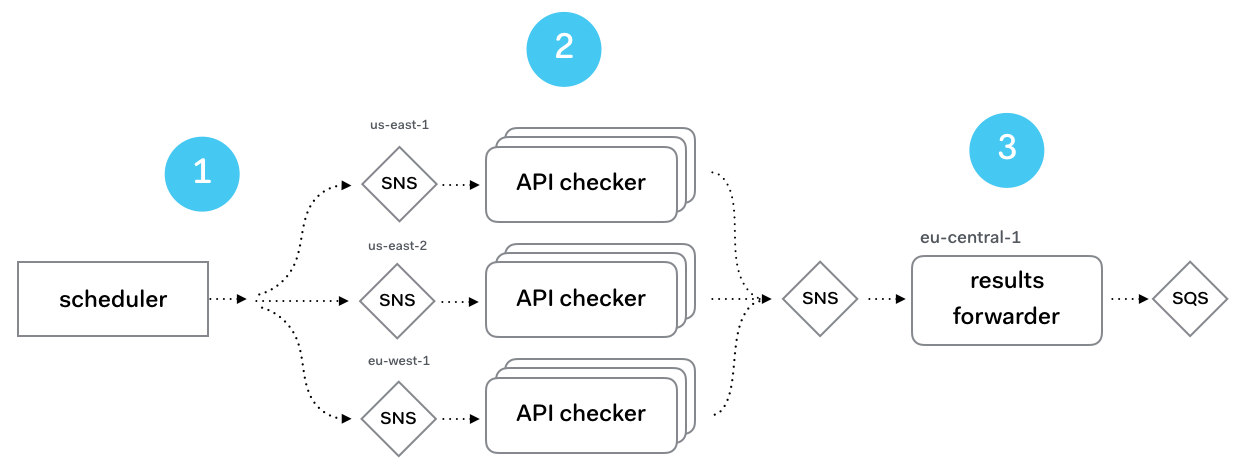 - A scheduler process reads all checks from a database and based on where they are configured to run — remember the region picker? — submits them to an SNS topic in a specific region.