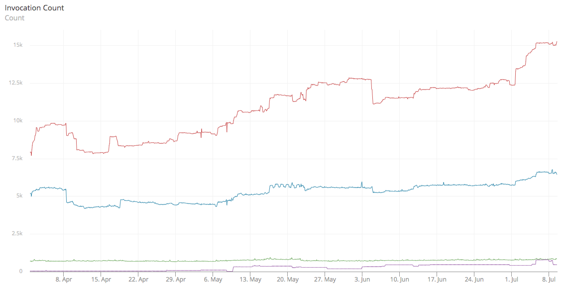 More vanity metrics. These are the amount of invocations for the three core functions and the one (busiest) plumbing function over the last three months, in total roughly 21 million invocations.