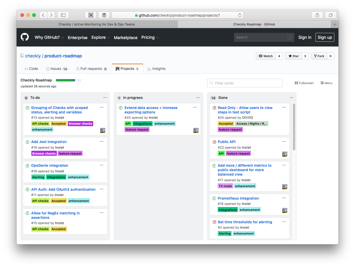 dashboardsandAPI checksissues are organized. The board has three columns just to keep things as simple as possible.