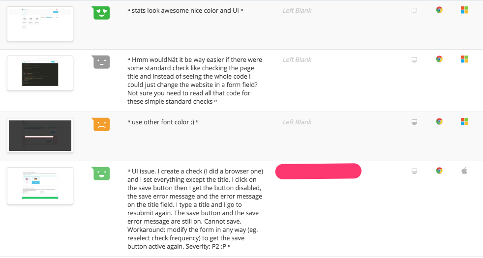 Surprisingly, this was quite successful but only because of Hotjar's Incoming feature. Incoming allows users to express how happy they are by selecting an emoticon and optionally point out details on a page by adding some text and a (partial) screenshot. You've seen it on a million sites by now.