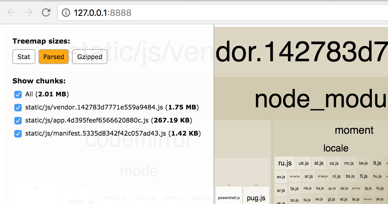 Codemirror is used on the browser check edit screen in the Checkly app. As with Moment.js, it ships with a whole bunch of code styles and themes we we’re not using. Lucky us, there was already a thin Vue.js wrapper for a slimmed down Codemirror install called VueCodeMirrorLite. After some minor code tweaks and a separate install of the Monokai theme and Javascript code style we saved almost 0.5MB!