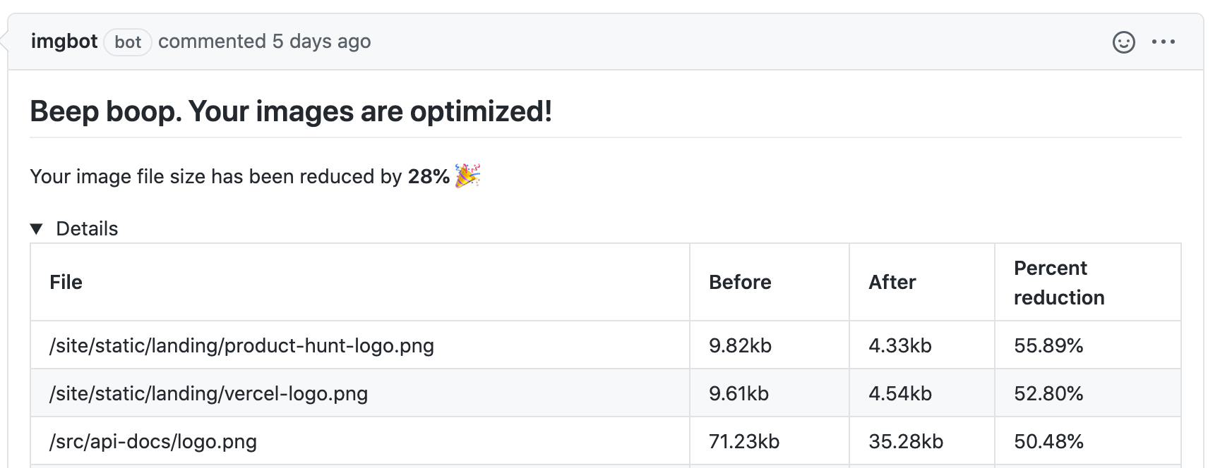 Luckily we found a neat little tool that promised to optimize our images without losing quality: Imgbot. Too good to be true? No, it worked! Imgbot reduced our file size by 28% and some of the most used pictures by more than 50% just by applying a lossless encoding. See below..