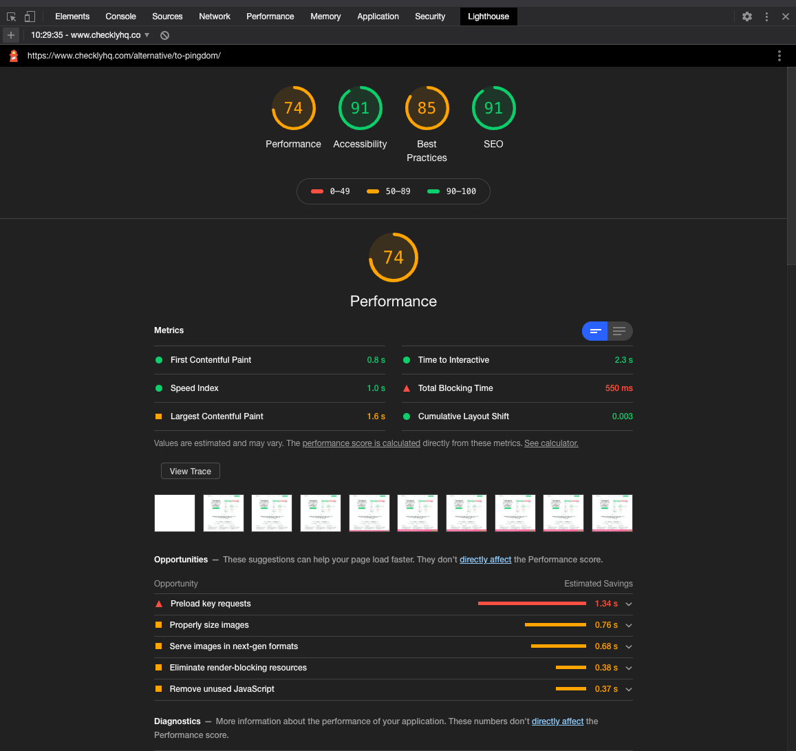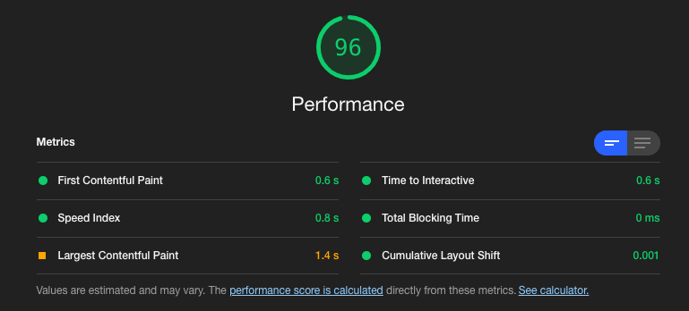 We recently optimized the hell out of our Lighthouse performance score, and one of our landing pages went from a low 70s score to a cool 96 and above score.