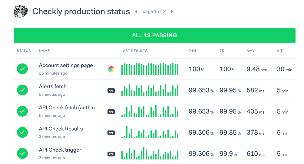 Public dashboards on Checkly show checks belonging to a set of tags. The checks shown here are a subset of the checks running against production. Among the checks you do not see are, for example, the ones for reported security vulnerabilities. There is also a similar set of checks running against our staging environment.