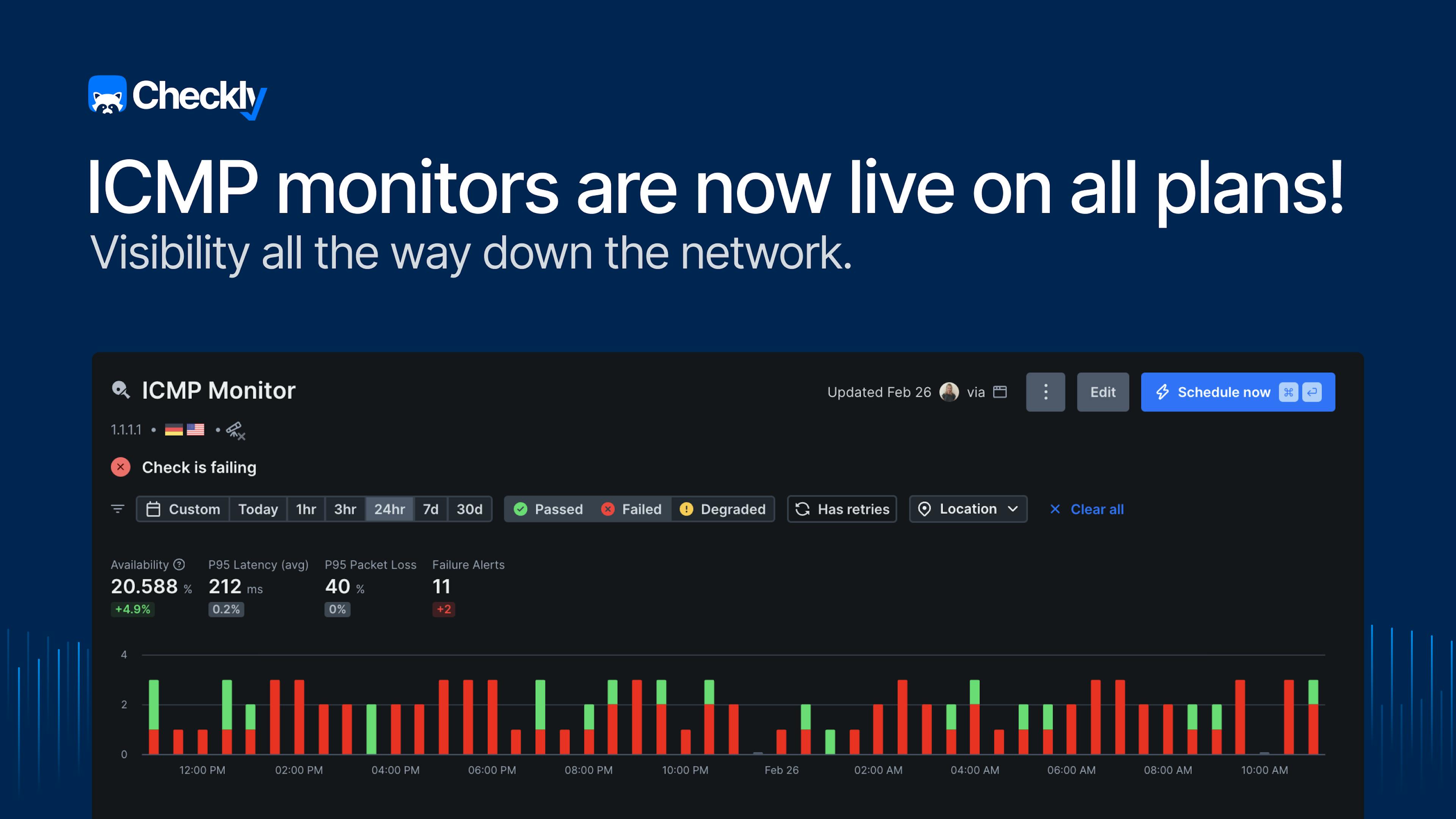 When we started building Checkly's uptime monitoring suite, the goal was to give engineering teams complete visibility across every layer of their stack, from application down to network, in one place. URL, TCP, DNS, and Heartbeat monitors covered a lot of that ground. But one fundamental piece was missing: the ability to simply ping a host and know if it's reachable.