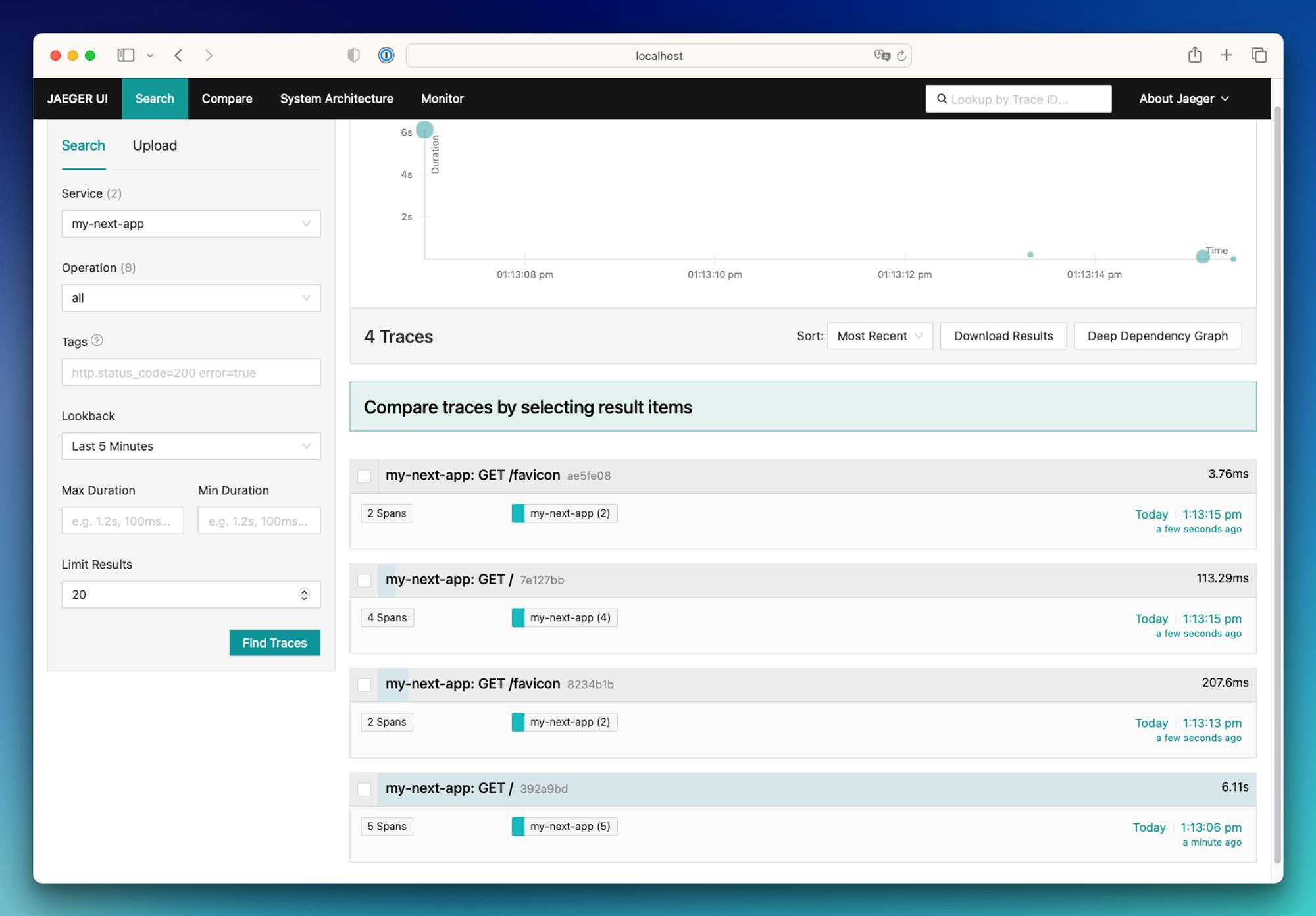 This should spin up some containers. We are mostly interested in the otel-collector and jaeger-all-in-one containers. Now open the local Jaeger web UI on http://localhost:16686/ and you should find your Next app and some collected traces.