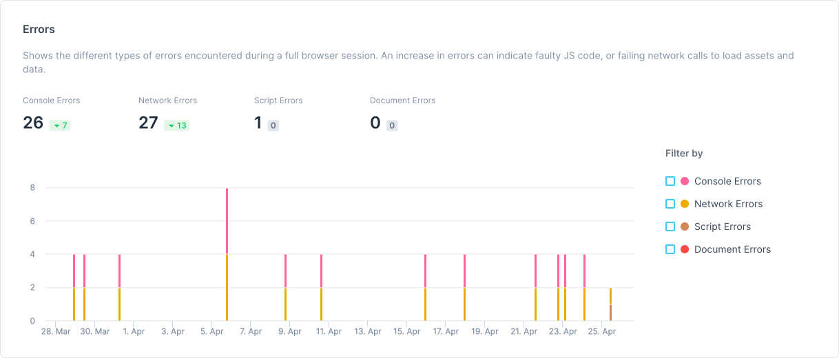 - For Browser Checks we give you a breakdown of Core Web Vitals (TTFB, FCP, LCP, TBT, and CLS.) and errors (Console, Network, Script, and Document).