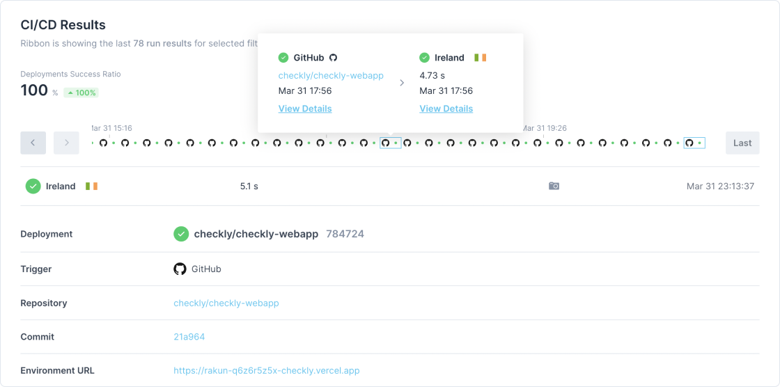 4. Access the stats on CI/CD Results in a dedicated section. Those results can come from our integrations (Vercel, GitHub and Command Line). All the deployments can be seen in the ribbon.