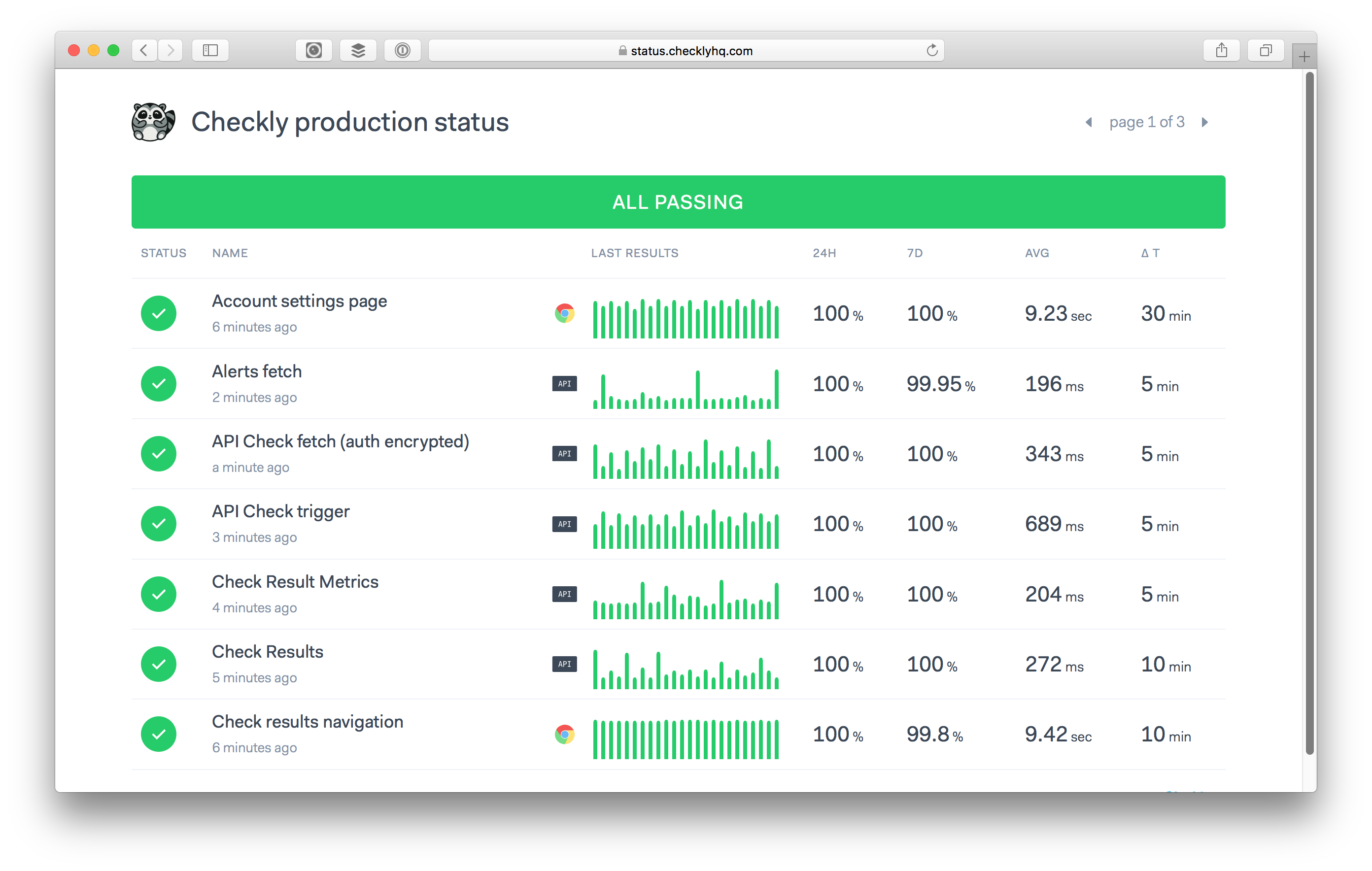 Customers of Checkly can create public dashboards and host them on a custom domain. This way they can show the status of their API endpoints and click flows on a big TV screen or as a status page for their customers, keeping the familiarity of their own domain name.