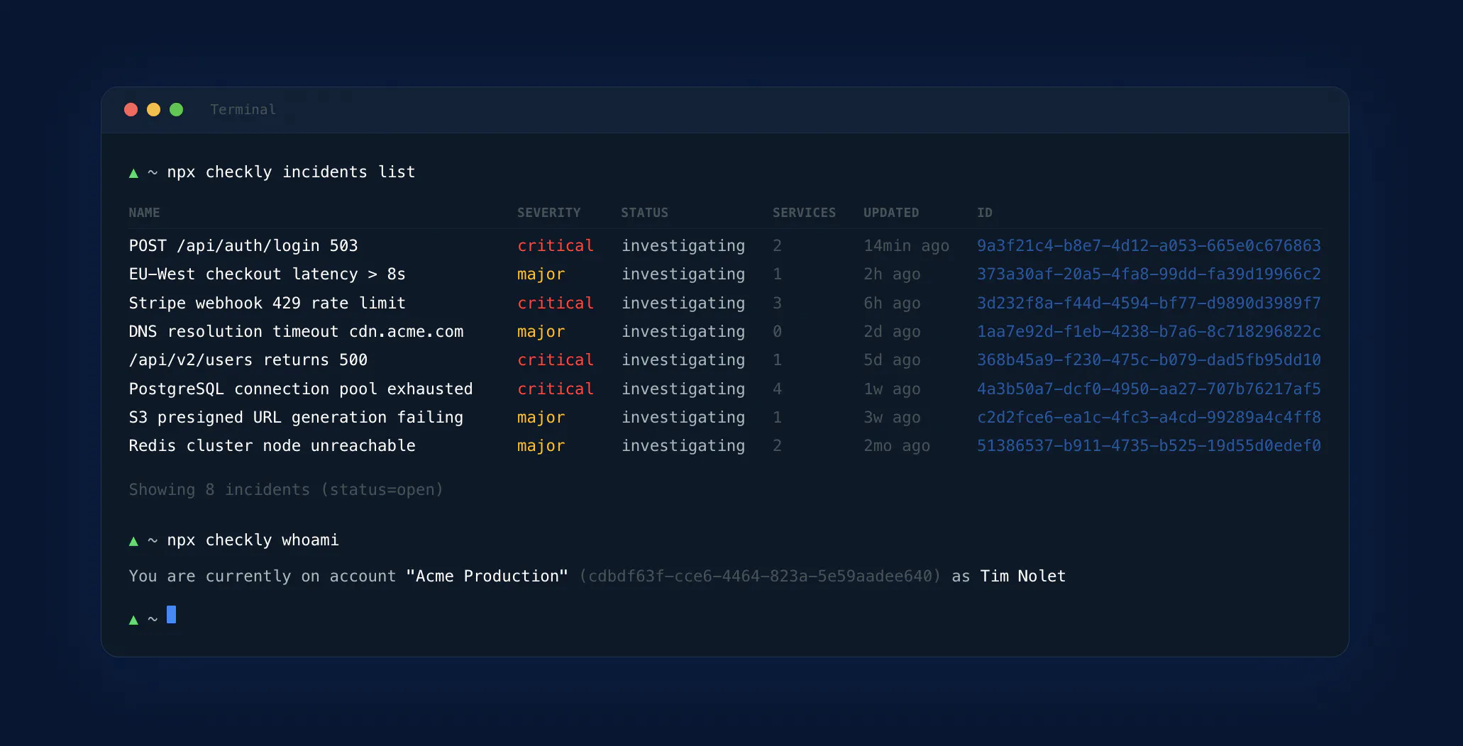 npx checkly incidents create --status-page-id <id> --title="API degradation" --severity=minor