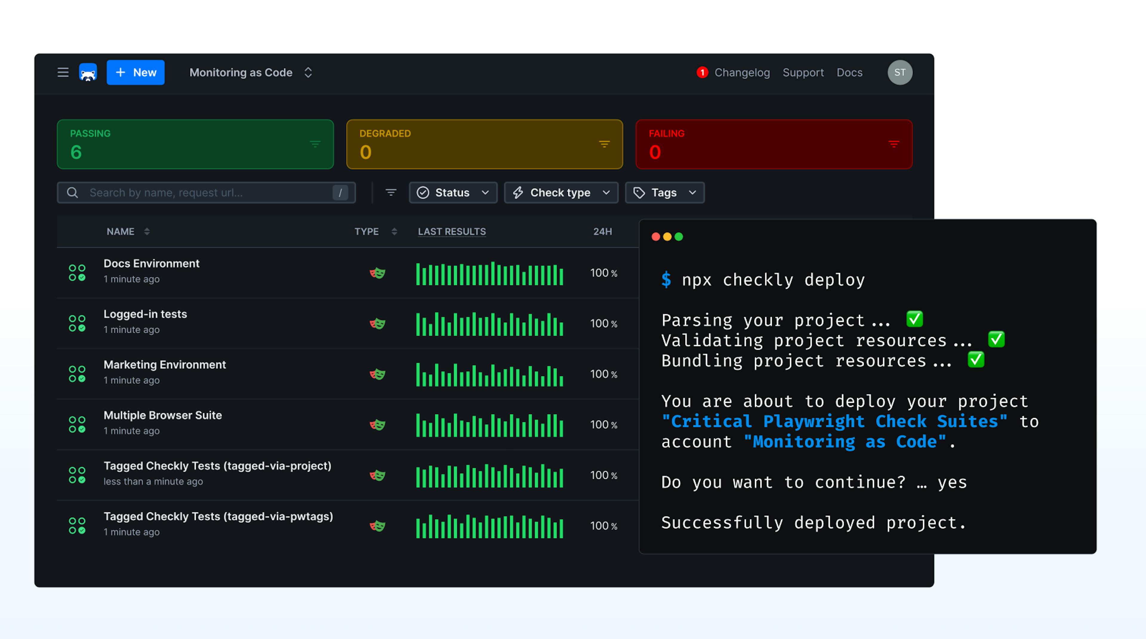 And that’s why we have built Playwright Check Suites; they’re a natural extension of your existing Playwright end-to-end test suite. Every Playwright project can now quickly become your most favorite monitoring solution.