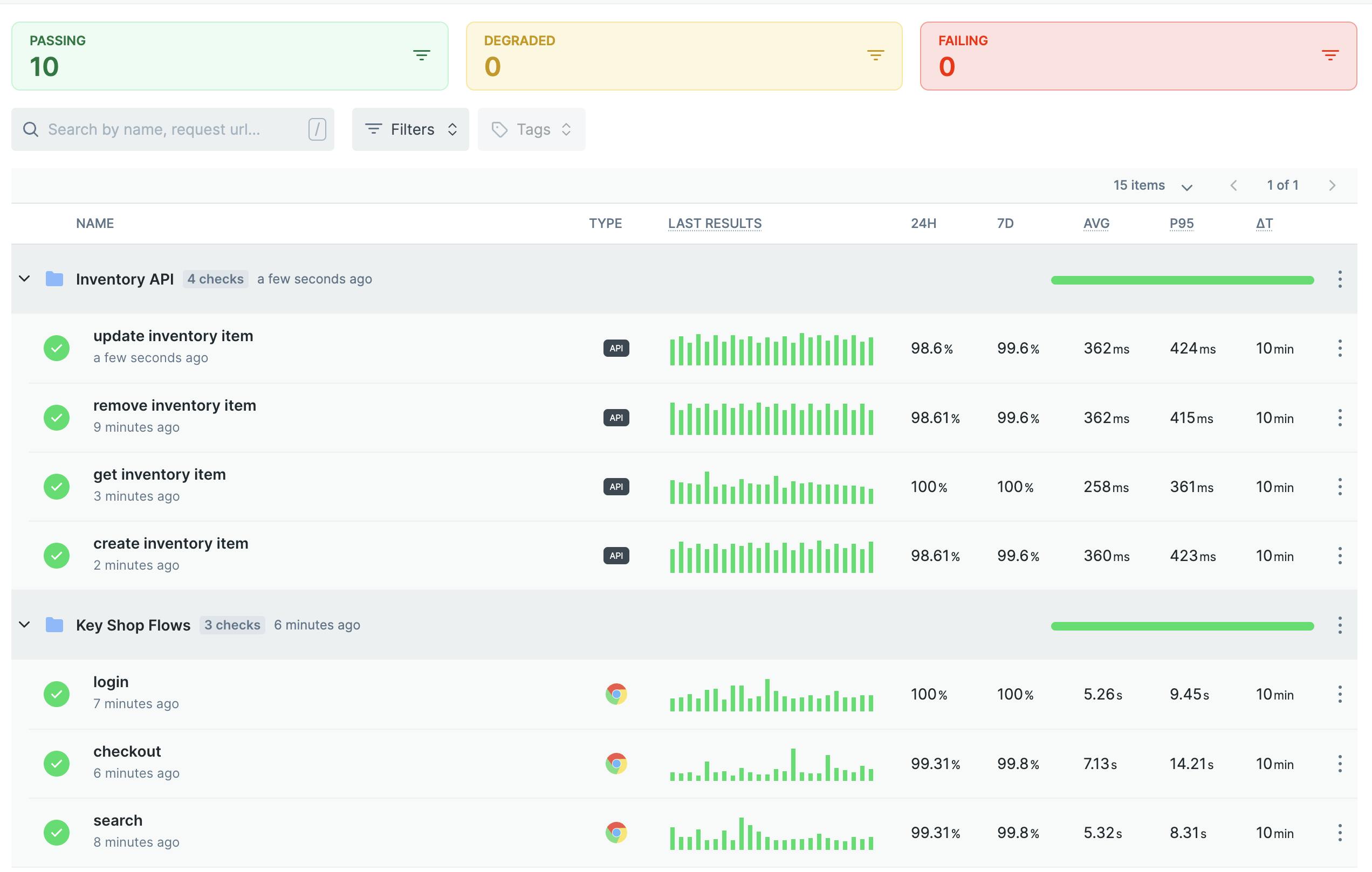 Checkly directly meets the needs of engineers, with their code living in version control. Code your monitoring on your local machine, test your preview deployments in CI, and monitor in production.